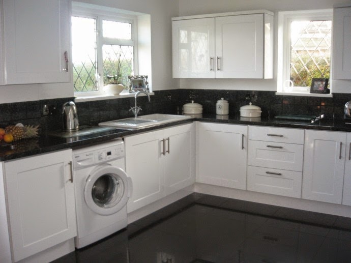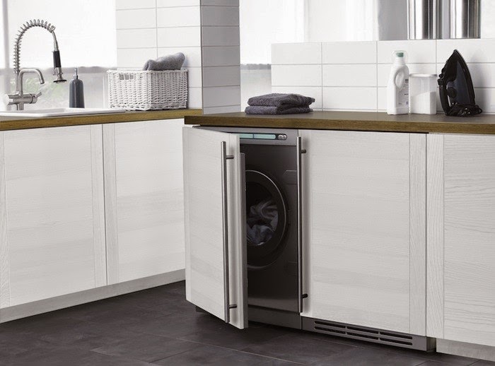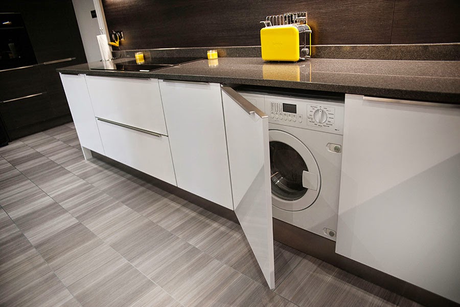 W tej kuchni jest pralka, ale tak dobrze zabudowana, że tylko właściciel wie gdzie się znajduje. Szafka na pralkę wygląda najczęściej dokładnie tak samo jak każda inna, różnica polega na braku dna ( jest to niewidoczne). Szafka na pralkę podobnie jak na każdy inny sprzęt jest nieco szersza.
