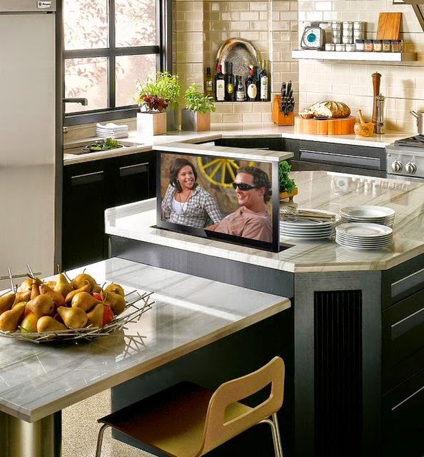Wiele osób nie wyobraża sobie kuchni bez telewizora, w nowoczesnych kuchniach niejednokrotnie czarny ekran nie pasuje do pięknej zabudowy. Wówczas możemy ukryć sprzęt w meblach, w taki sposób by był nie widoczny kiedy jest wyłączony.