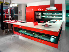 Czerwony- pobudza zmysły, dodaje energii, wyostrza apetyt, smaki i zapachy. Czerwień jest doskonałą barwą do kuchni, jednak należy uważać ponieważ nieumiejętnie użyta może zmniejszyć i przytłoczyć pomieszczenie. Czerwone meble doskonale sprawdzą się w dużych kuchniach, w mniejszych bezpiecznej jest zastosować ten kolor w postaci dodatków.