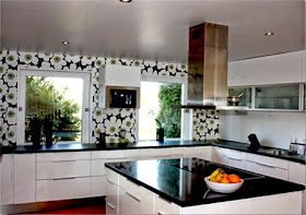 W tym wypadku należy uważać by nie przesadzić, najlepiej sprawdzają się dwukolorowe motywy podkreślające barwę mebli i blatu.