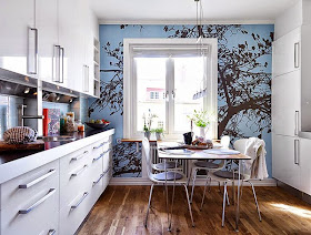 Tapeta i grafika na ścianie kuchennej nie muszą się ograniczać do przestrzeni między górnymi i dolnymi szafkami. Ściany kuchenne mają najczęściej neutralny kolor, jeśli meble są jednolite doskonałym uzupełnieniem będzie fototapeta, umieszczona na jednej ze ścian,