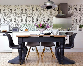 Kolejna propozycja to biała, lakierowana współczesna kuchnia i zachwycająca mini jadalnia, tapeta, oraz lampa w stylu glamour.