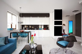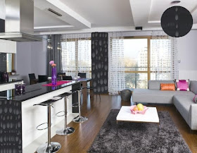 Aby wnętrze było spójne i obie części ze sobą współgrały wystarczy zorganizować " strefę przejściową", czyli niewielką przestrzeń na której salon będzie zaglądał do kuchni, lub odwrotnie. Jest to powierzchnia, gdzie można powtórzyć tapetę, bądź tkaninę zastosowaną w salonie, lub inny detal, który zaznaczy że jest to jedno pomieszczenie.
