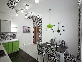 W pomieszczeniach z dużą zabudową kuchenną, w których większość ścian została zabudowana, podział na strefy można wprowadzić w postaci stołu i krzeseł w innym kolorze niż reszta zabudowy, odrębnej lampy wiszącej nad stołem, niedużego, modnego chodnika kuchennego.