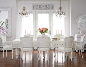możemy urządzić w stylu chabby chic, nawet jeśli jest ona połączona z nowczesną kuchnią. Aby urządzić jadalnię w tym stylu potrzebujemy: